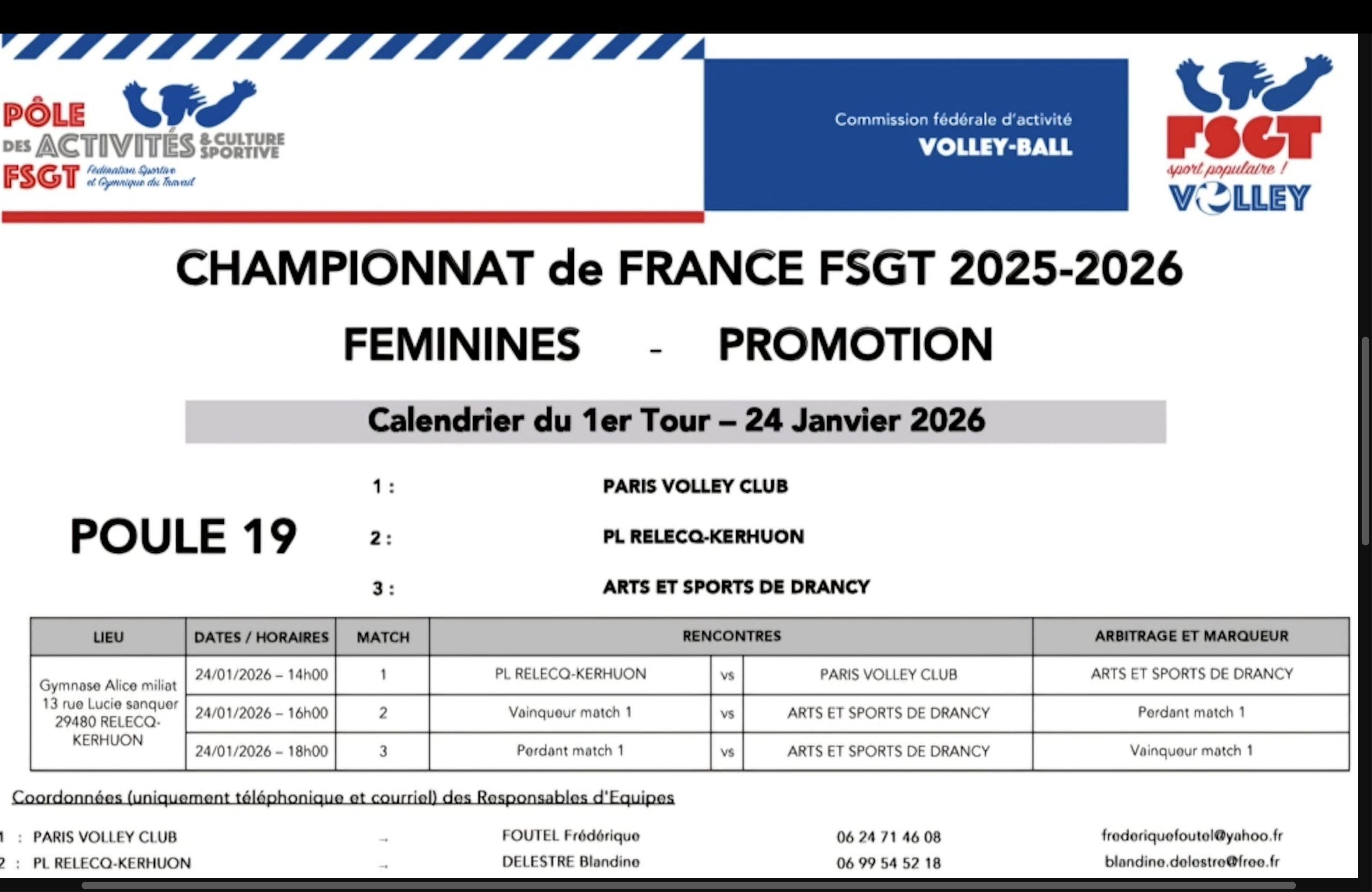 La commission Volley-ball FSGT 29 rappelle que la date butoir des matchs aller 2025-2026 est fixée au vendredi 19 décembre 2025.